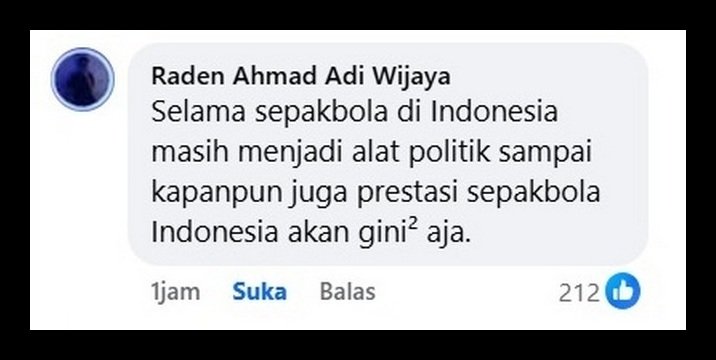 “Selama sepakbola di Indonesia masih menjadi alat politik sampai kapanpun juga prestasi sepakbola Indonesia akan gini² aja,” ujar Raden Ahmad Adi Wijaya.