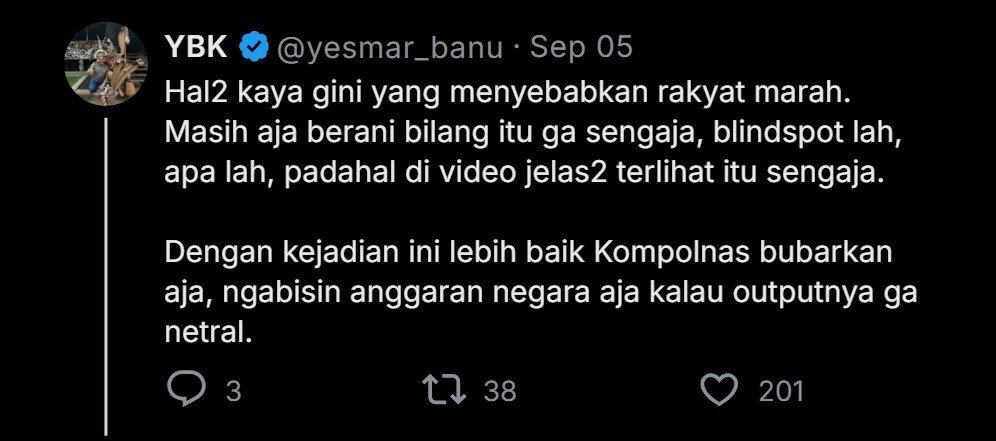“Hal2 kaya gini yang menyebabkan rakyat marah. Masih aja berani bilang itu ga sengaja, blindspot lah, apa lah, padahal di video jelas2 terlihat itu sengaja.