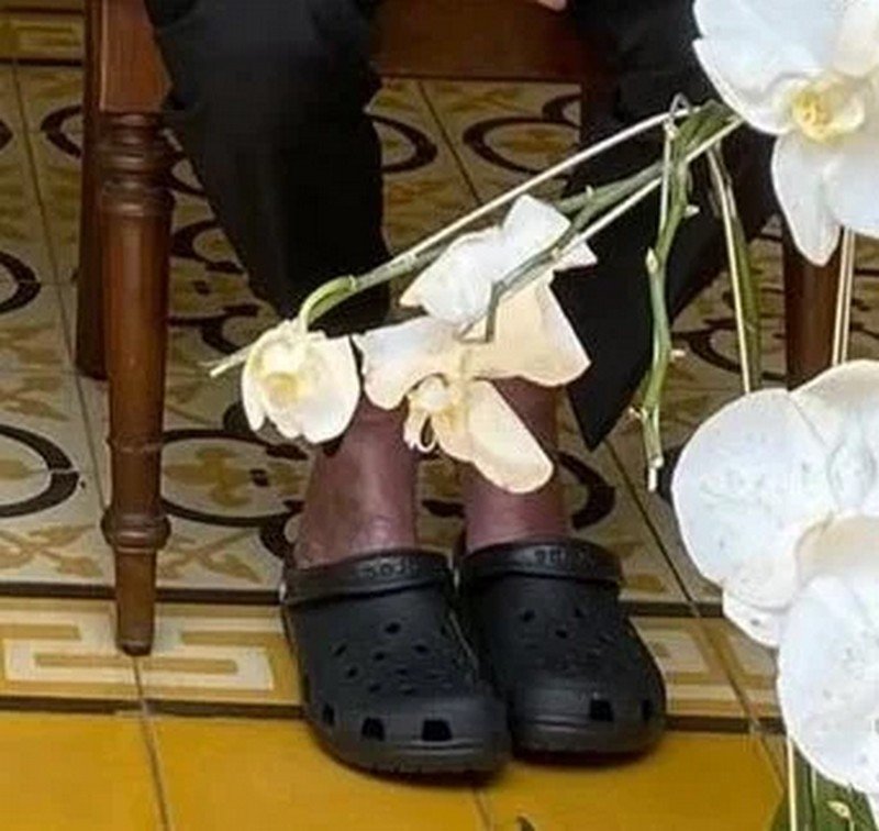 Jokowi yang tidak memakai sepatu membuat sebagian kulit punggung kakinya terlihat.