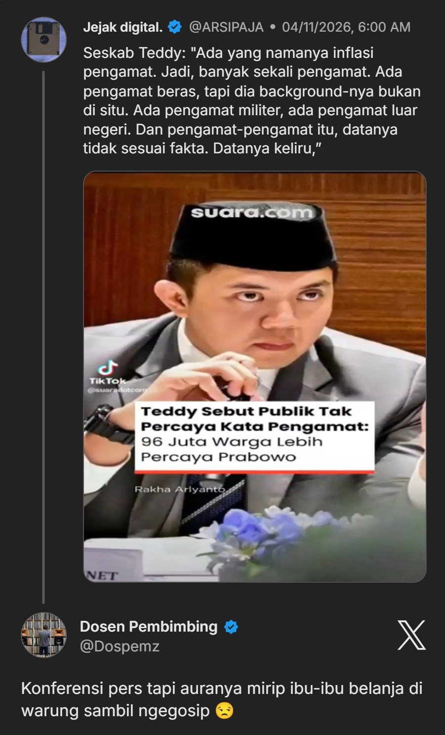 “Dan sebagian besar pengamat-pengamat itu adalah pengamat-pengamat yang sejak dulu berusaha mempengaruhi warga, bahkan sejak Pak Prabowo belum jadi presiden, jadi pengamat-pengamat itu sudah mempengaruhi warga..”
