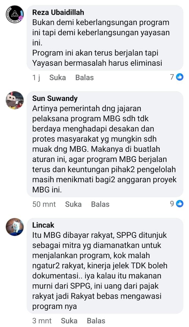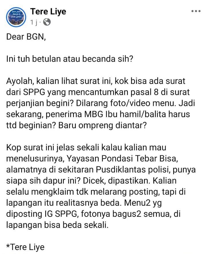 Kop surat ini jelas sekali kalau kalian mau menelusurinya, Yayasan Pondasi Tebar Bisa, alamatnya di sekitaran Pusdiklantas polisi, punya siapa sih dapur ini? Dicek, dipastikan. Kalian selalu mengklaim tdk melarang posting, tapi di lapangan itu realitasnya beda. Menu2 yg diposting IG SPPG, fotonya bagus2 semua, di lapangan bisa beda sekali.