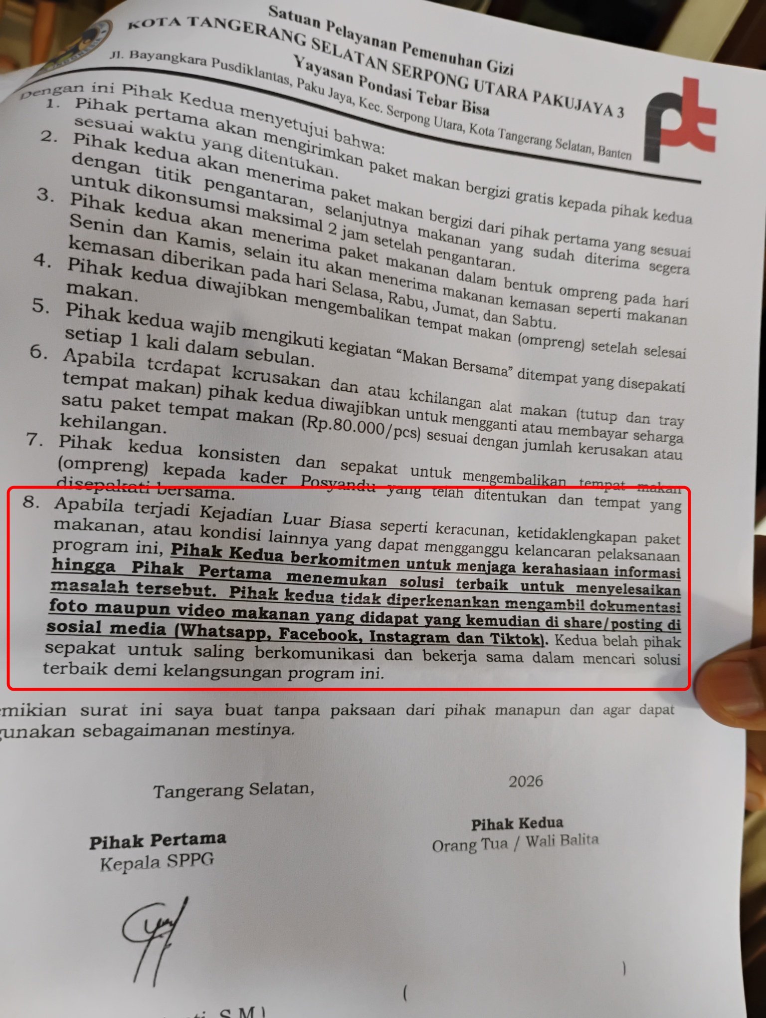 Ayolah, kalian lihat surat ini, kok bisa ada surat dari SPPG yang mencantumkan pasal 8 di surat perjanjian begini? Dilarang foto/video menu. Jadi sekarang, penerima MBG Ibu hamil/balita harus ttd beginian? Baru ompreng diantar?