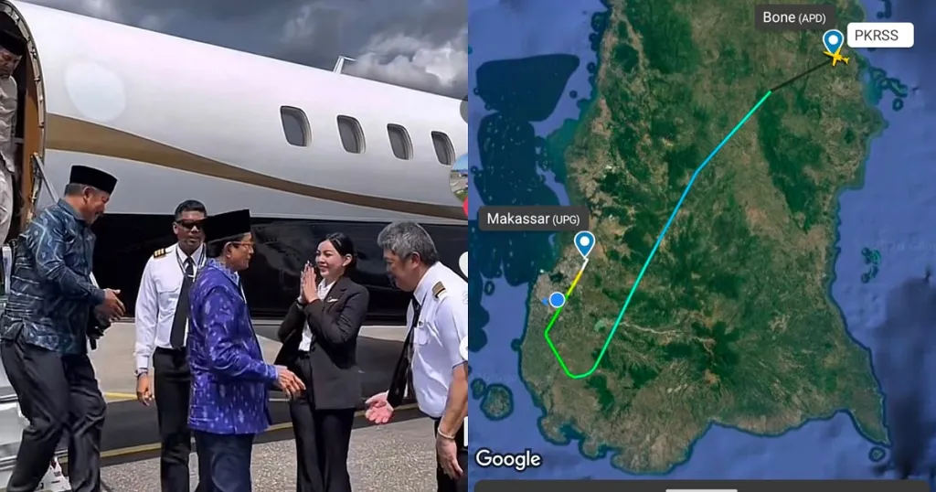Menteri Agama Nasaruddin Umar menggunakan pesawat jet pribadi saat menghadiri peresmian Gedung Balai Sarkiah di Kabupaten Takalar, Sulawesi Selatan, pada Minggu, 15 Februari 2026.