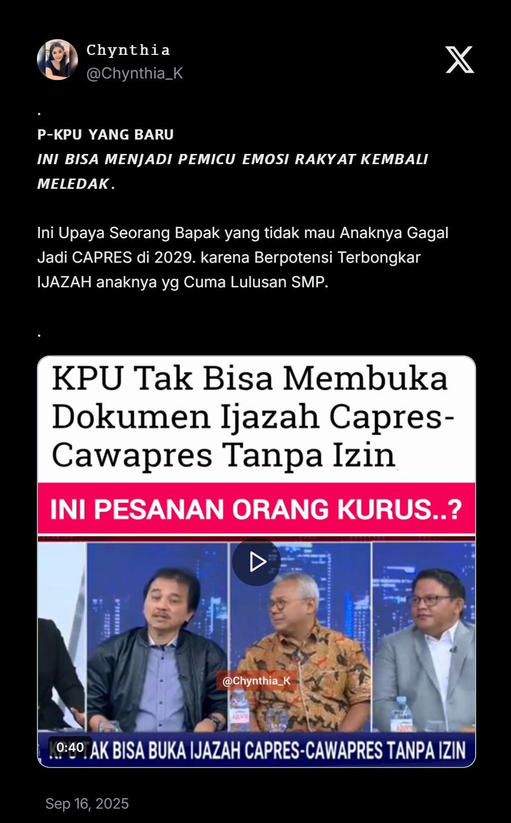 Ini Upaya Seorang Bapak yang tidak mau Anaknya Gagal Jadi CAPRES di 2029. karena Berpotensi Terbongkar IJAZAH anaknya yg Cuma Lulusan SMP,” ujar netizen X @Chynthia_K.