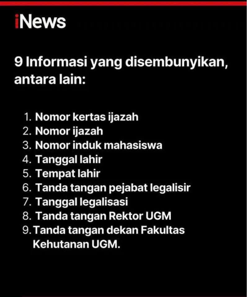 Data yang diblokir meliputi nomor kertas ijazah, nomor ijazah, nomor induk mahasiswa, tanggal dan tempat lahir, serta tanda tangan pejabat legalisir, rektor, dan dekan fakultas. Semua elemen tersebut dihitamkan agar tidak dapat dibaca publik.
