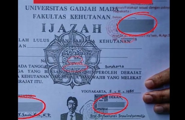 Data yang diblokir meliputi nomor kertas ijazah, nomor ijazah, nomor induk mahasiswa, tanggal dan tempat lahir, serta tanda tangan pejabat legalisir, rektor, dan dekan fakultas. Semua elemen tersebut dihitamkan agar tidak dapat dibaca publik.