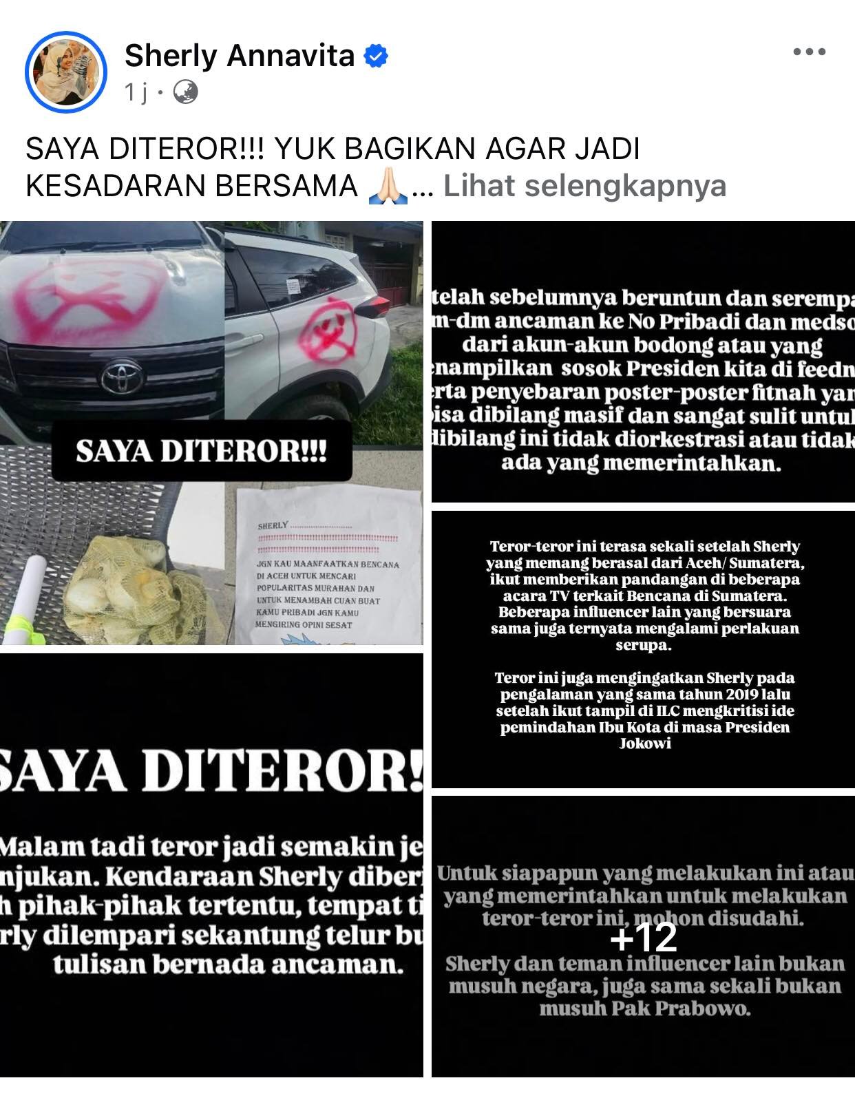 Bukan hanya teror terhadap nomor HP, DM Instagram hingga makian sejumlah akun bodong. Kendaraan (mobil) Sherly juga diteror dengan semprotan cat merah, bahkan Influencer berdarah Aceh ini juga dikirimi telur busuk lengkap dengan pesan bernada ancaman.