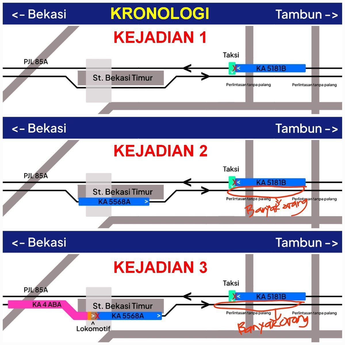 - KRL 2 Terhenti: KRL 2 (rute Kampung Bandan-Cikarang) akhirnya berhenti di Stasiun Bekasi Timur karena menunggu KRL 1 (Cikarang-Angke) bisa melintas lagi setelah insiden dengan taksi.