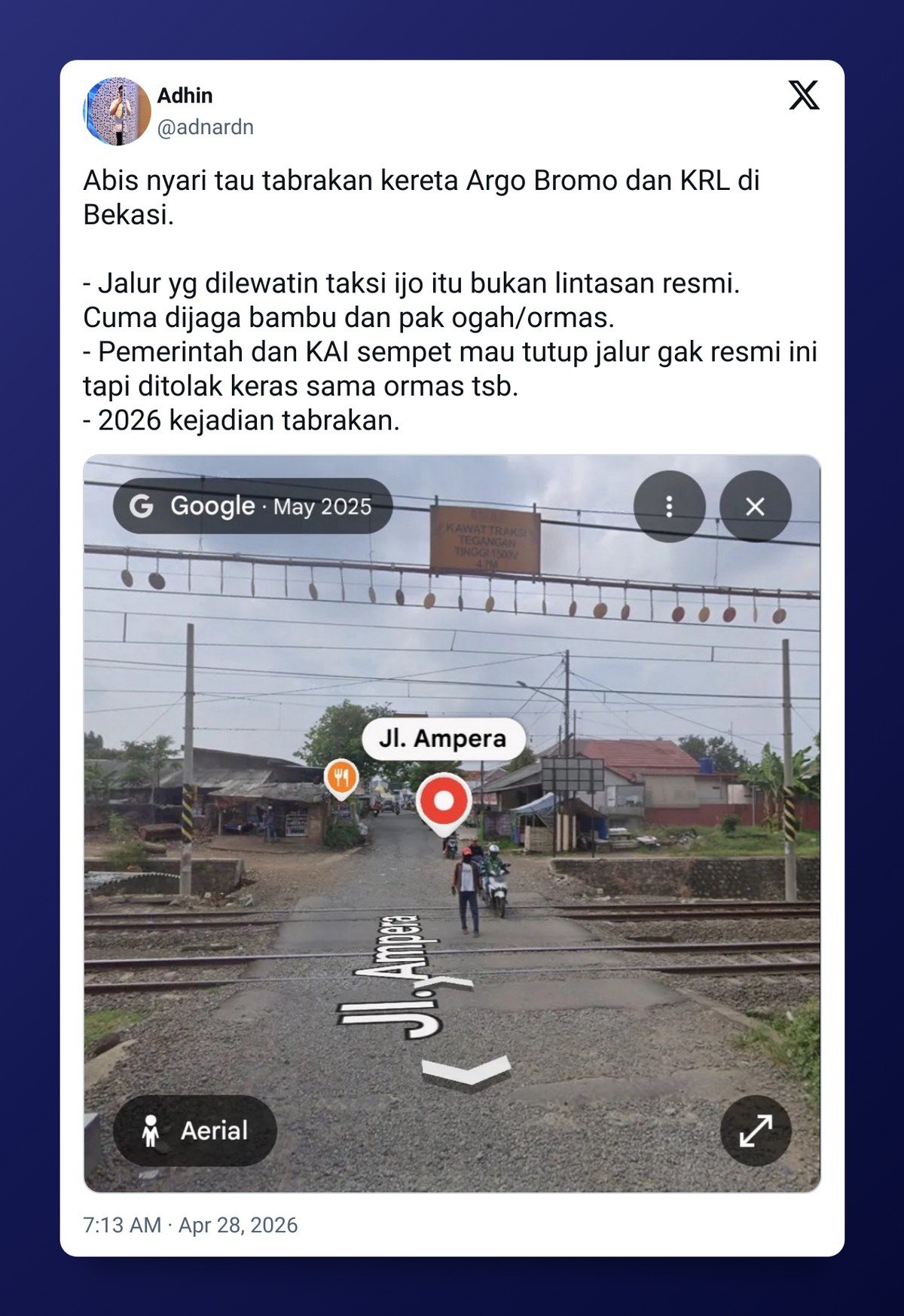 - Taksi Mogok di Perlintasan (Sekitar Pukul 21.00 WIB): Sebuah taksi listrik Green SM mengalami mogok tepat di tengah perlintasan kereta api di kawasan Bulak Kapal/Jalan Ampera, Bekasi. Taksi listrik diduga mati mesin (mogok mendadak) akibat efek getaran lokomotif.