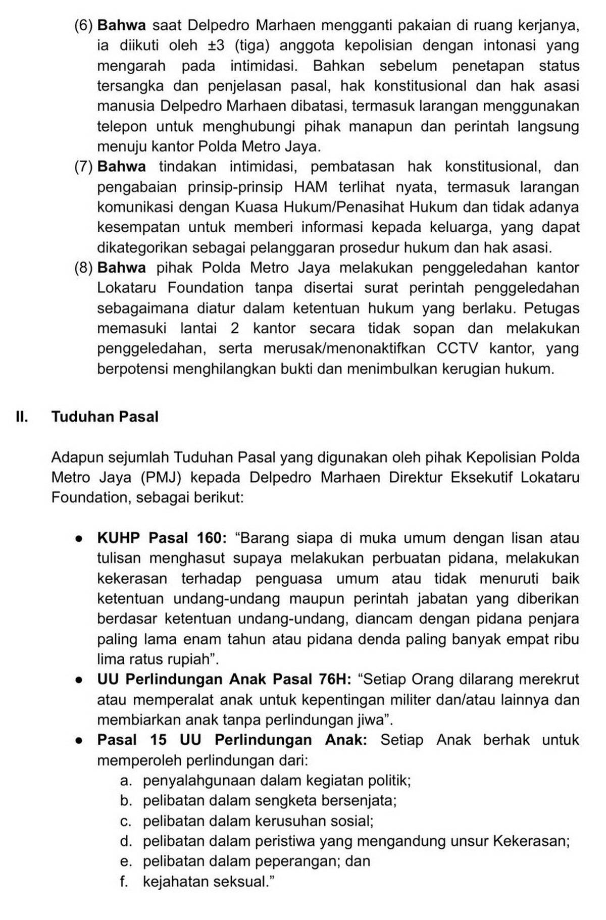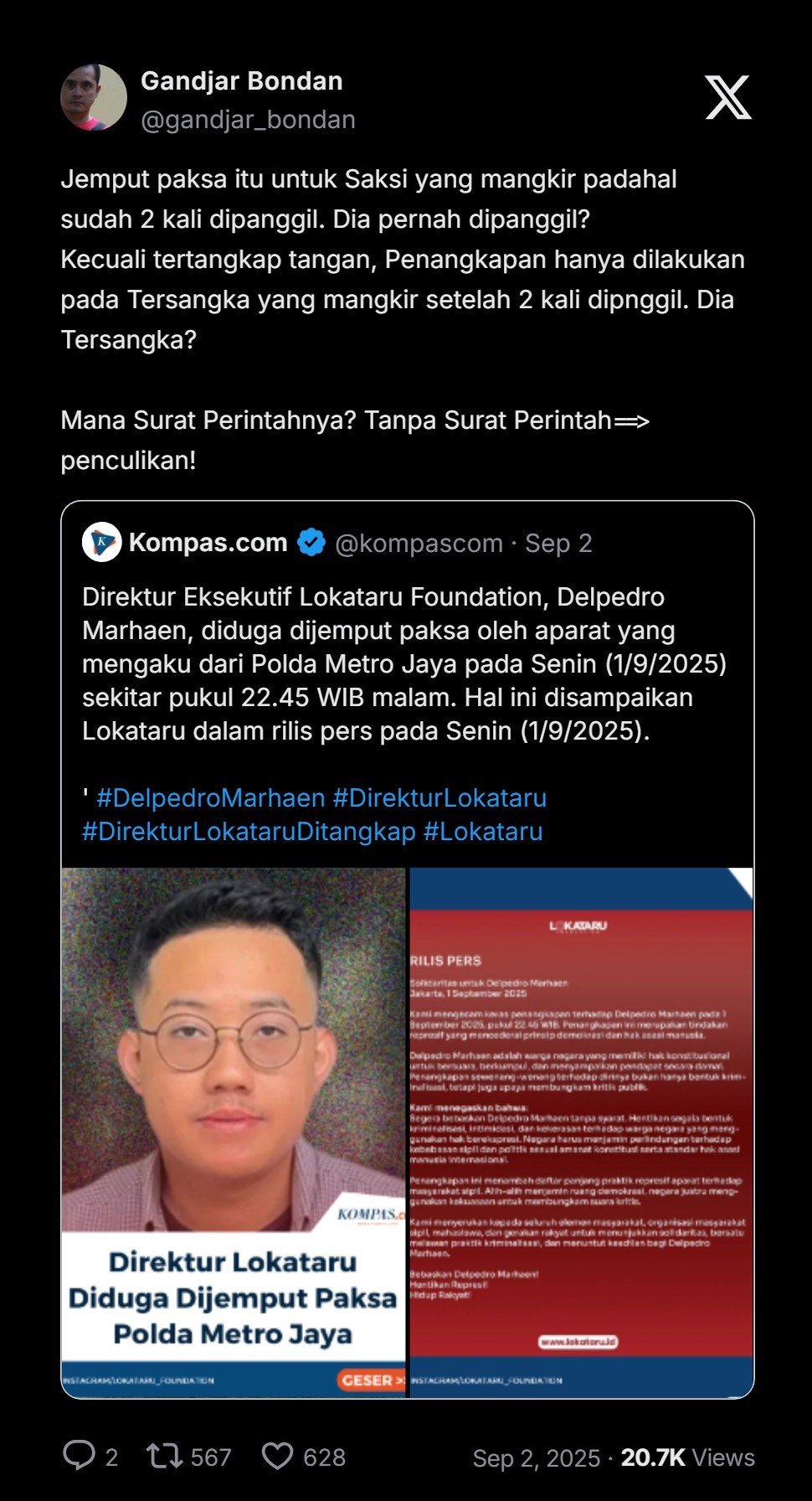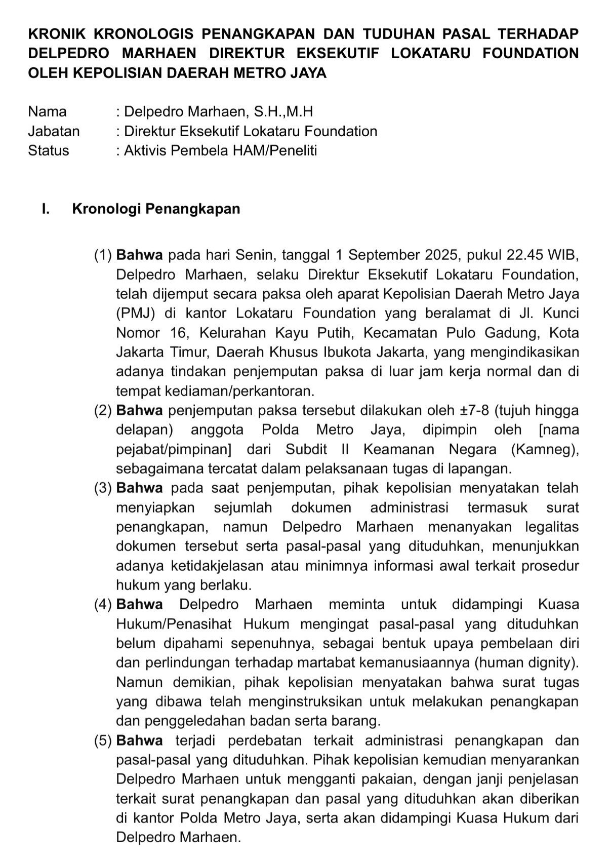 Polda Metro Jaya menangkap Direktur Lokataru Delpedro Marhaen (DMR) yang diduga melakukan ajakan dan hasutan provokatif.