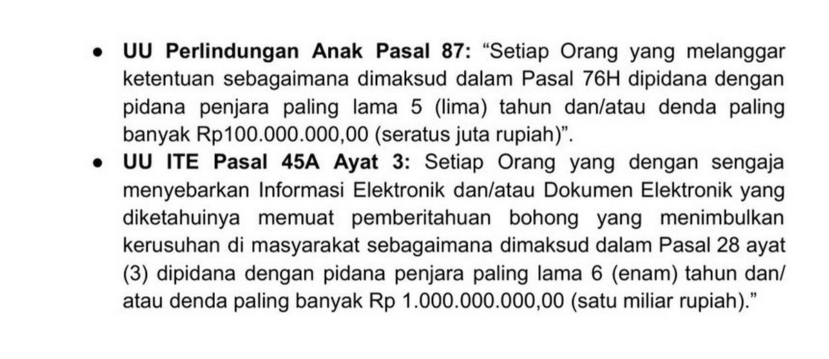 Pelaku, lanjut Ade Ary, juga merekrut dan memperalat anak, membiarkan anak tanpa perlindungan jiwa yang melanggar pasal 160 KUHP atau pasal 45A ayat 3 jo pasal 28 ayat 3 UU Nomor 1 Tahun 2024 tentang Informasi dan Transaksi Elektronik.