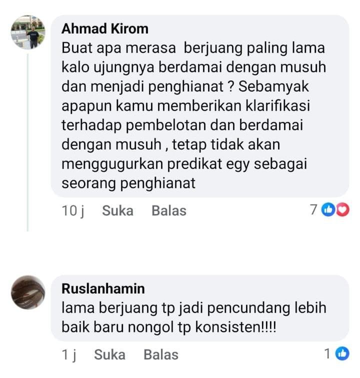 “Buat apa merasa berjuang paling lama kalo ujungnya berdamai dengan musuh dan menjadi penghianat ? Sebamyak apapun kamu memberikan klarifikasi terhadap pembelotan dan berdamai dengan musuh , tetap tidak akan menggugurkan predikat egy sebagai seorang penghianat.” (Ahmad Kirom)