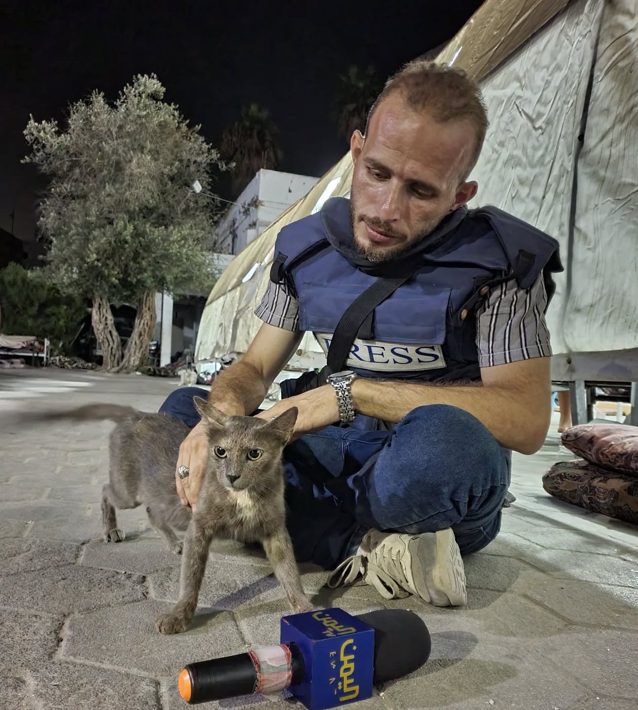 “Saya sedang duduk bekerja di halaman Rumah Sakit Baptis Gaza, merekam kejadian-kejadian ketika seekor kucing kecil kurus menghampiri saya, matanya dipenuhi ketakutan dan kesedihan. Ia mengintai di antara orang-orang dan pintu-pintu yang terbuka, mencari makanan atau tempat berlindung, seolah tahu bahwa segalanya di sini terancam.