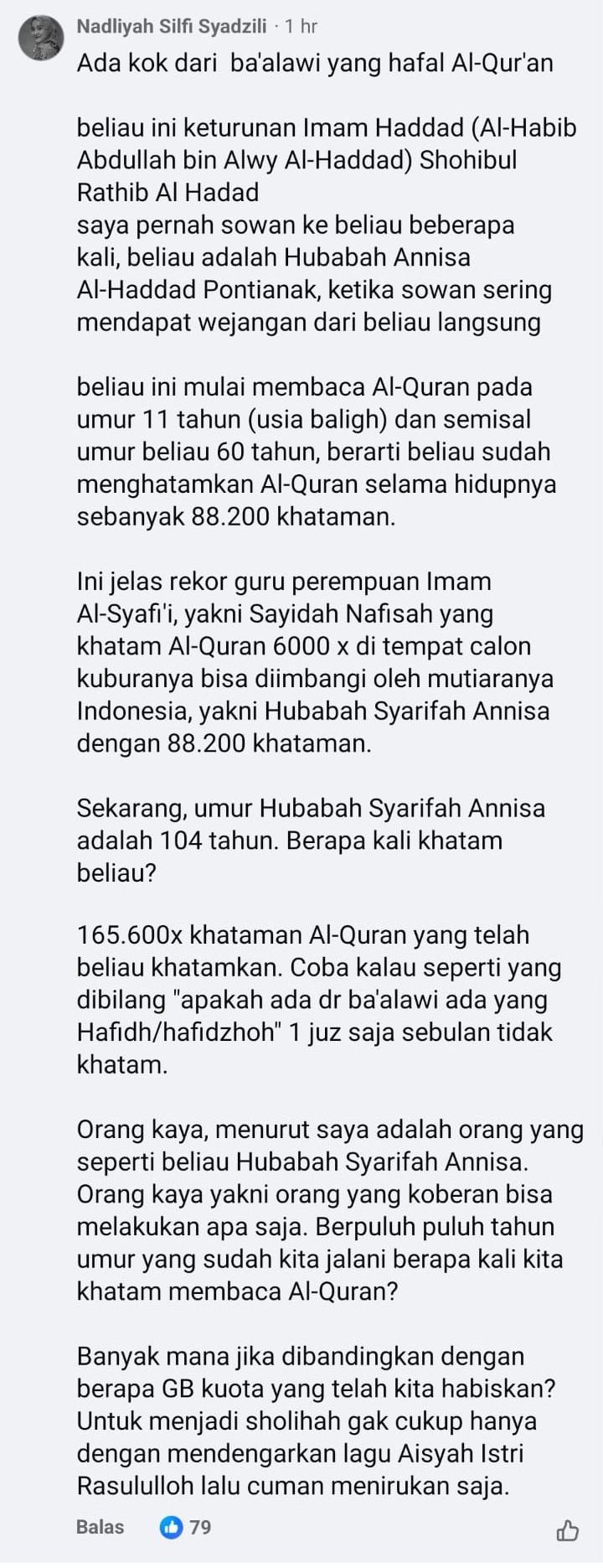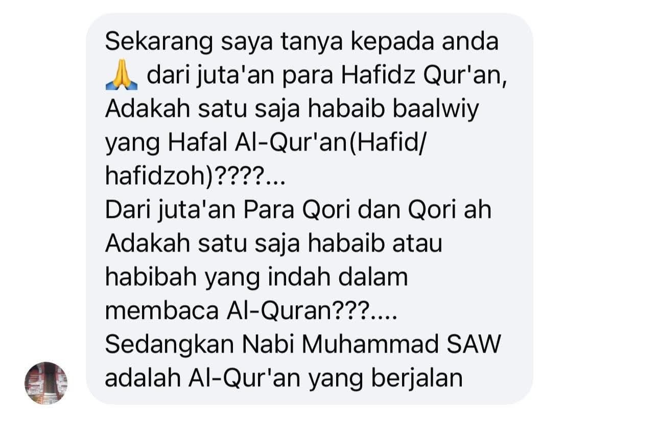 “Sekarang saya tanya kepada anda🙏 dari juta’an para Hafidz Qur’an, Adakah satu saja habaib baalwiy yang Hafal Al-Qur’an(Hafid/hafidzoh)????…