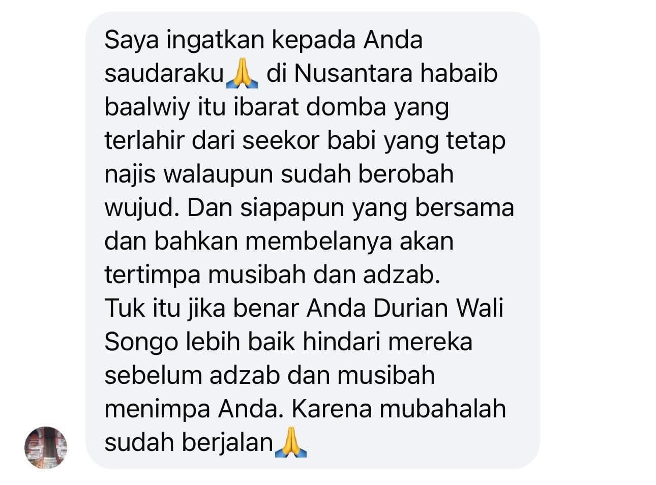 Tuk itu jika benar Anda Duriah Wali Songo lebih baik hindari mereka sebelum adzab dan musibah menimpa Anda. Karena mubahalah sudah berjalan🙏 “