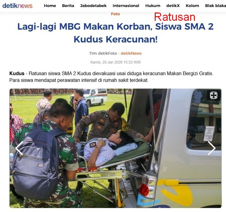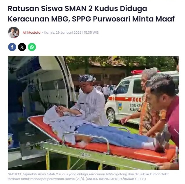 RATUSAN siswa Sekolah Menengah Atas Negeri 2 Kudus mengalami keracunan setelah menyantap hidangan makan bergizi gratis atau MBG pada Kamis, 29 Januari 2026.