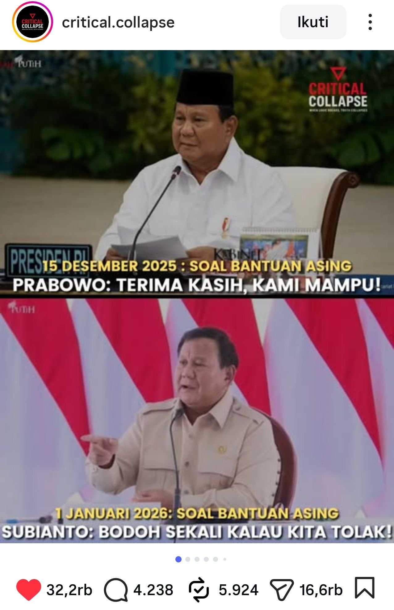 “Kalau siapapun yang mau bantu, masa kita tolak. Bodoh sekali kalau kita tolak,” katanya, dikutip dari kanal YouTube kanal YouTube Sekretariat Presiden, Jumat (2/1/2026).