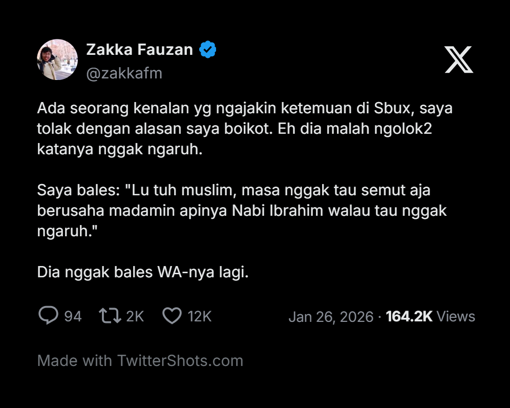 Ada seorang kenalan yg ngajakin ketemuan di Sbux, saya tolak dengan alasan saya boikot. Eh dia malah ngolok2 katanya nggak ngaruh.