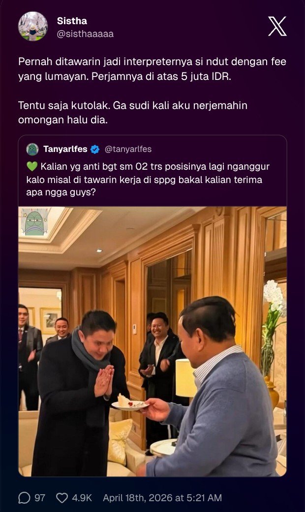 💚 Kalian yg anti bgt sm 02 trs posisinya lagi nganggur kalo misal di tawarin kerja di sppg bakal kalian terima apa ngga guys?
