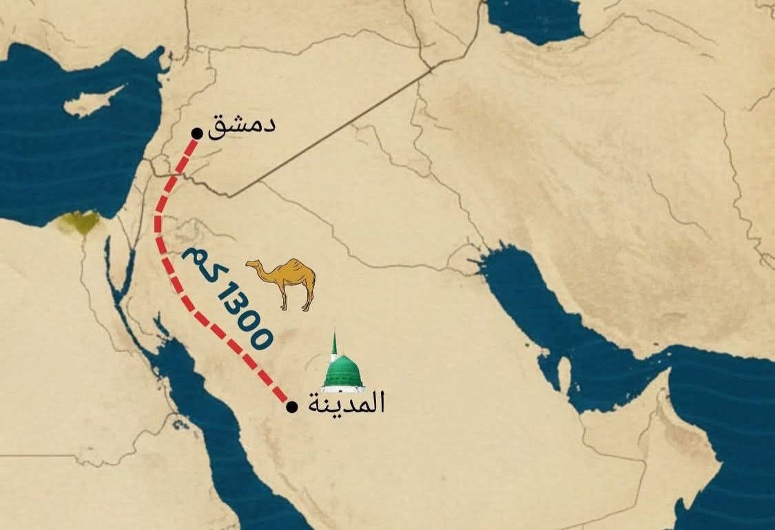 Itu rute perjalanan panjang banget… lebih dari 1300 km naik unta dari Madinah sampai Damaskus (Syam).