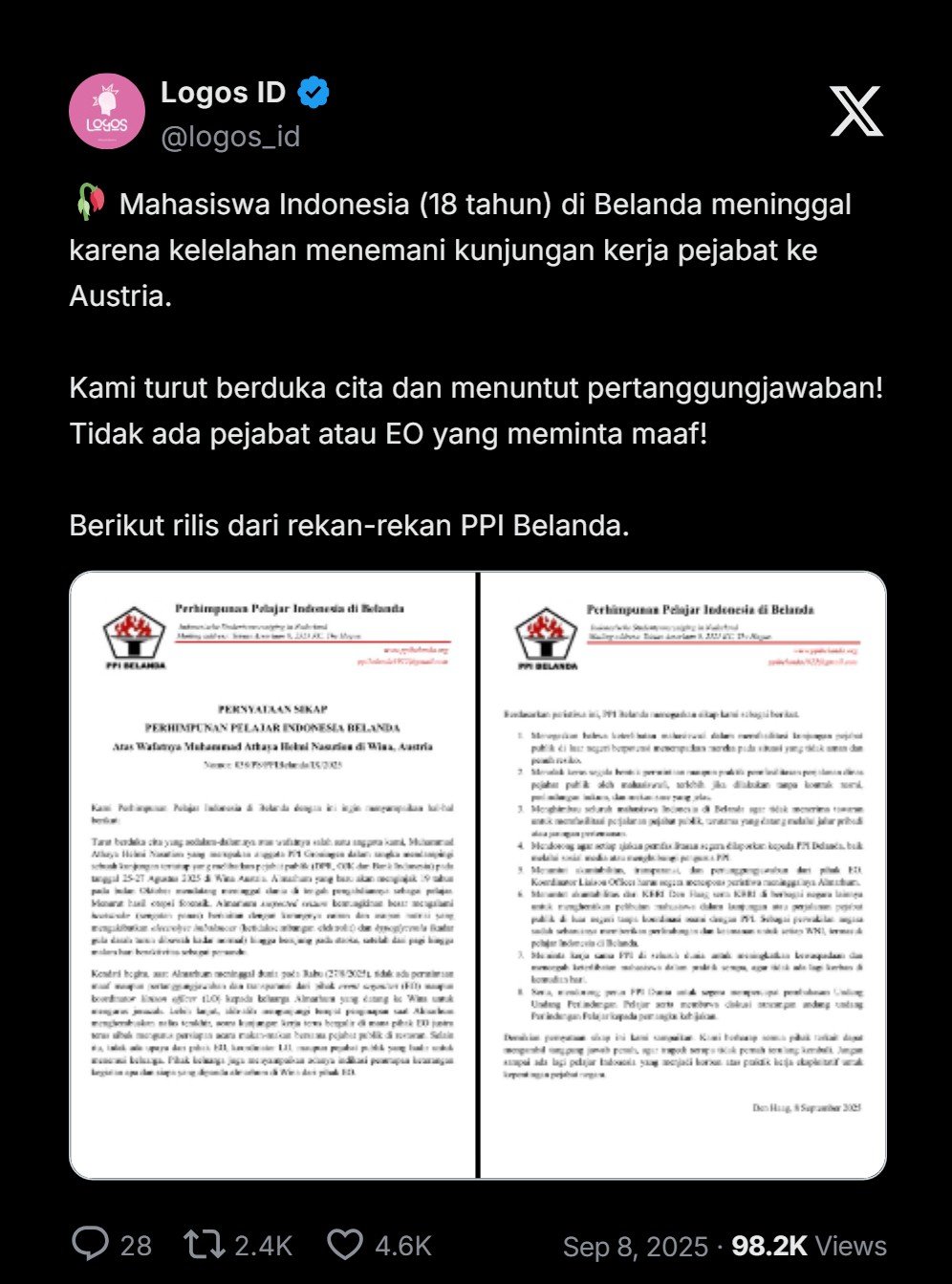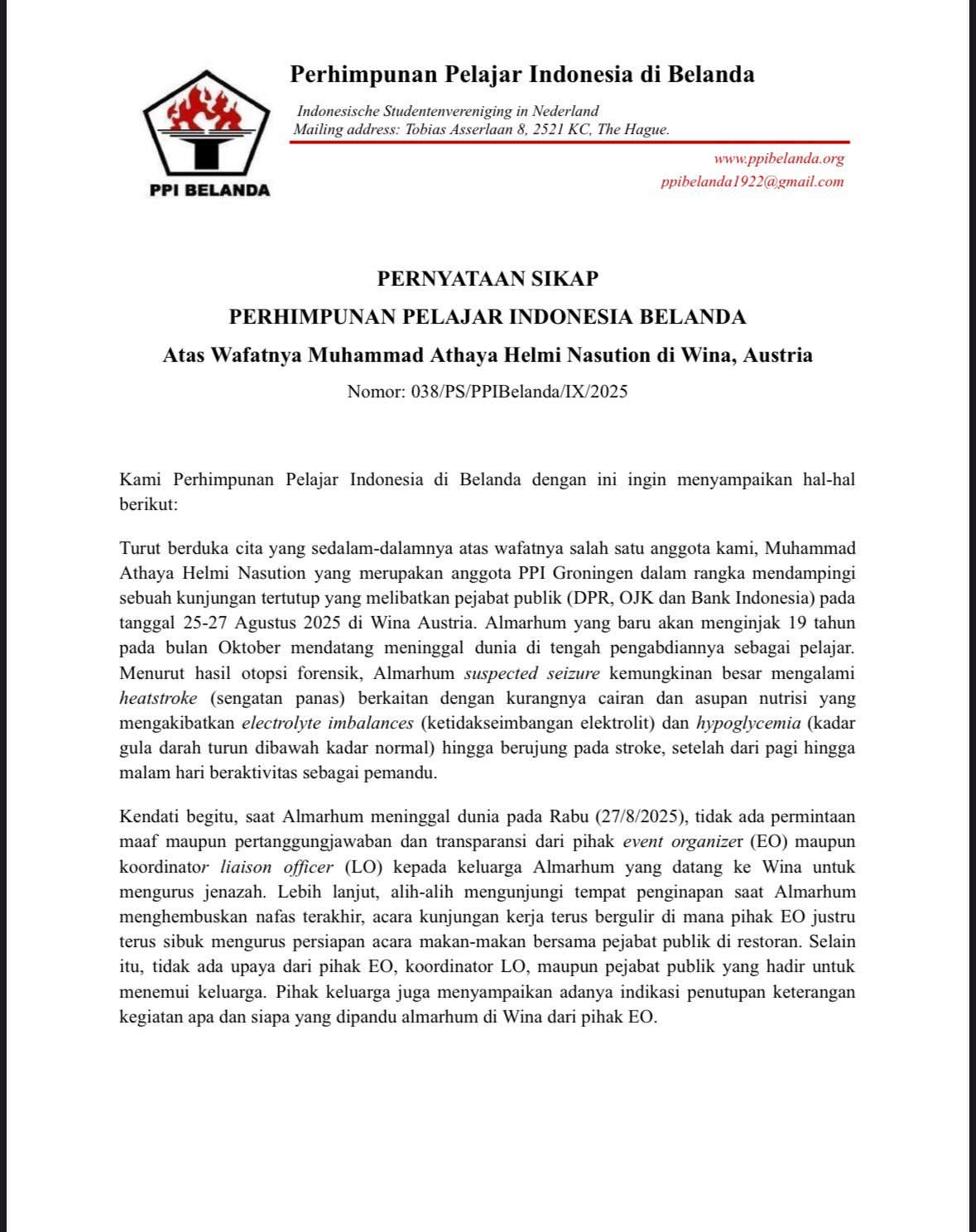 PPI Belanda menyebutkan, Athaya meninggal diduga saat bertugas mendampingi kunjungan tertutup yang melibatkan pejabat publik, termasuk DPR, OJK, dan Bank Indonesia, pada 25-27 Agustus 2025 di Wina, Austria.