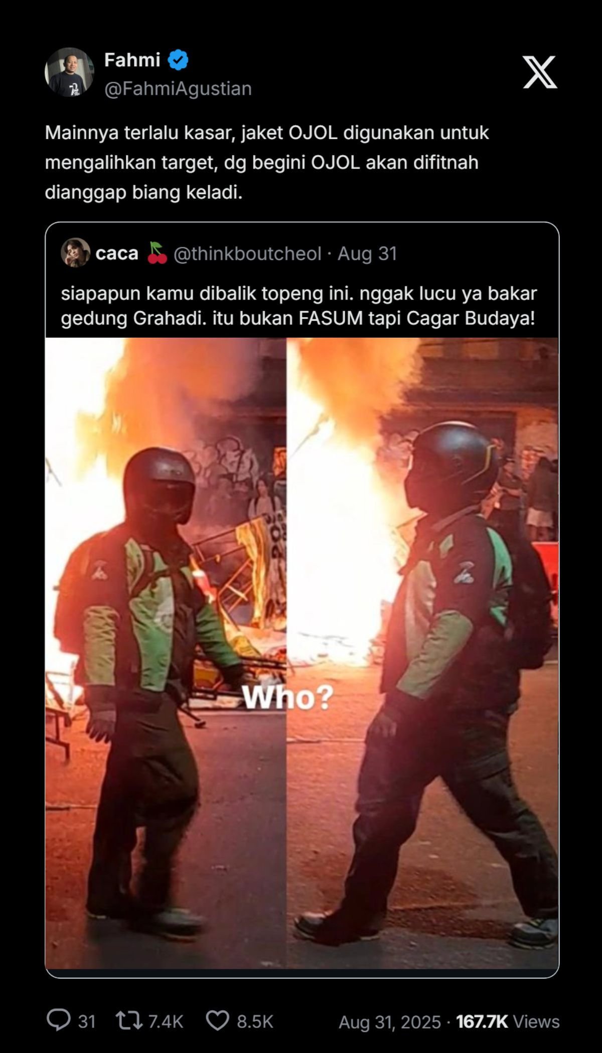Mainnya terlalu kasar, jaket OJOL digunakan untuk mengalihkan target, dg begini OJOL akan difitnah dianggap biang keladi. https://t.co/r9G6pPwWsP— Fahmi (@FahmiAgustian) August 31, 2025