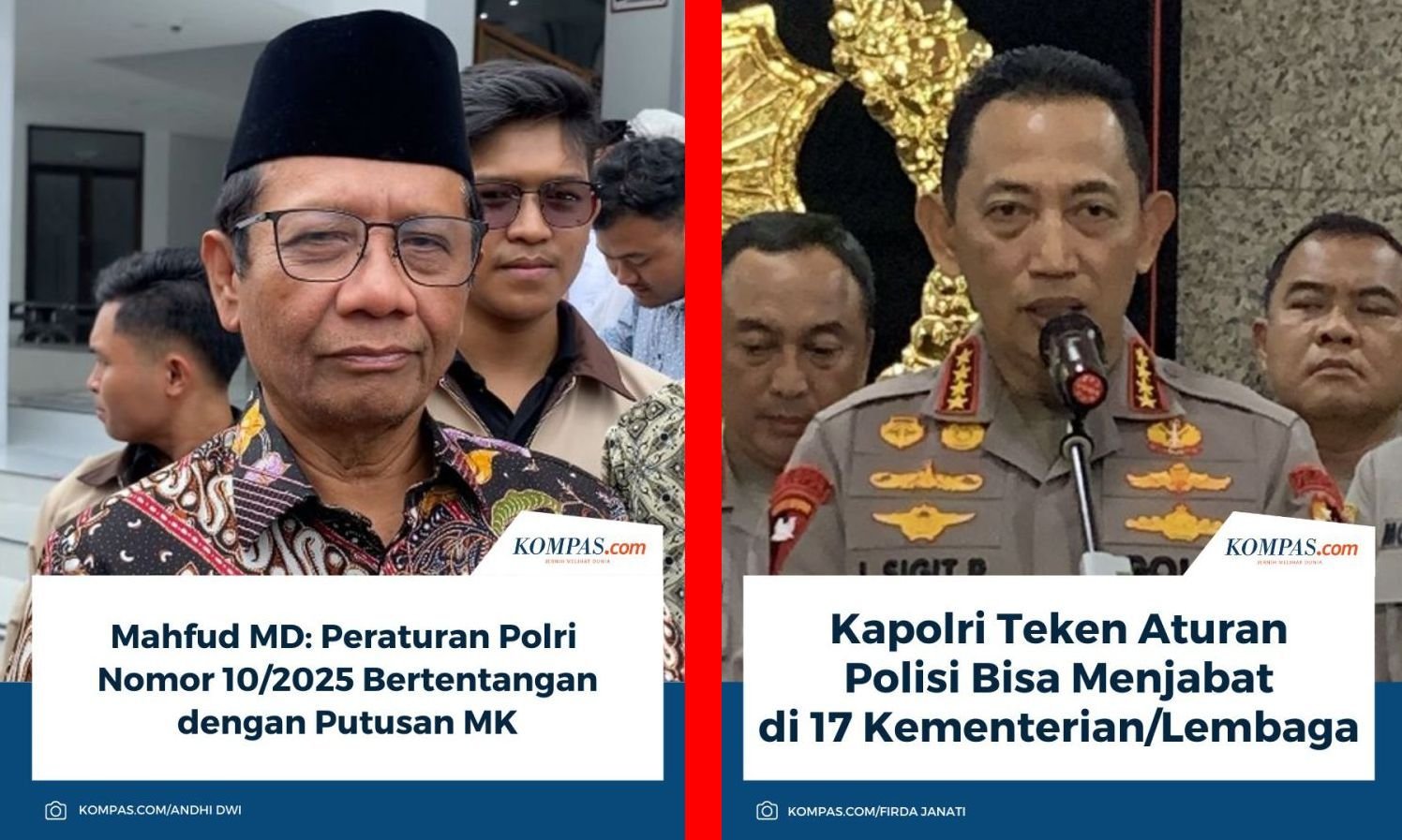 “Perpol Nomor 10 Tahun 2025 itu bertentangan dengan konstitusionalitas Pasal 28 ayat (3) UU Nomor 2 Tahun 2002 tentang Polri yang menurut putusan MK Nomor 114/PUU-XXIII/2025 anggota Polri, jika akan masuk ke institusi sipil harus minta pensiun atau berhenti dari Polri. Tidak ada lagi mekanisme alasan penugasan dari Kapolri,” kata Mahfud kepada Kompas.com, Jumat (12/12/2025).