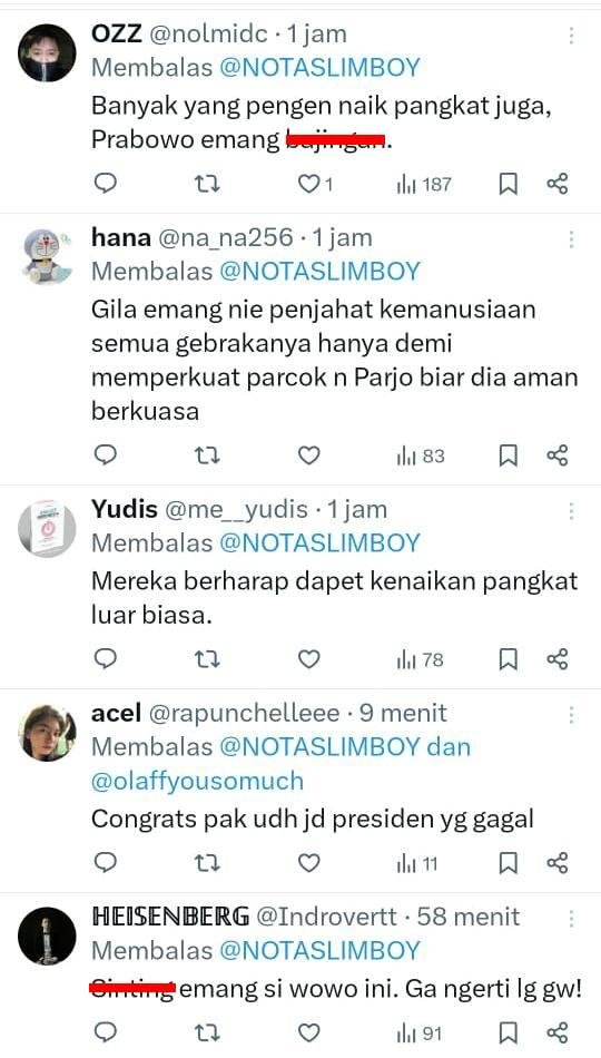 “Semua petugas dinaikin pangkat, dinaikin pangkat luar biasa karena bertugas di lapangan, membela negara, membela rakyat, menghadapi anasir-anasir,” ujar Prabowo.