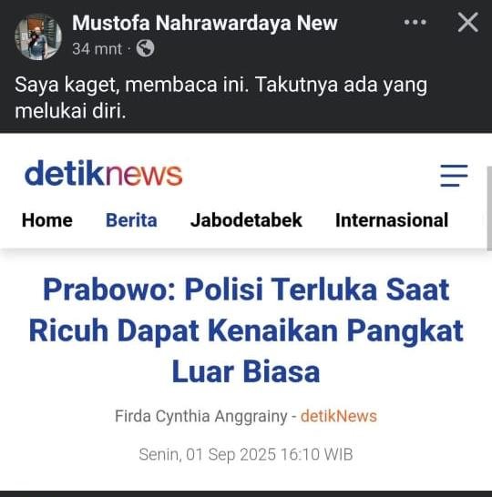 Arahan ini diutarakan langsung oleh Prabowo saat menjenguk polisi yang cedera di RS Polri, Kramat Jati, Jakarta Timur, Senin (1/9/2025). Prabowo meminta agar semua anggota tersebut nantinya diberi kenaikan pangkat luar biasa (KPLB).