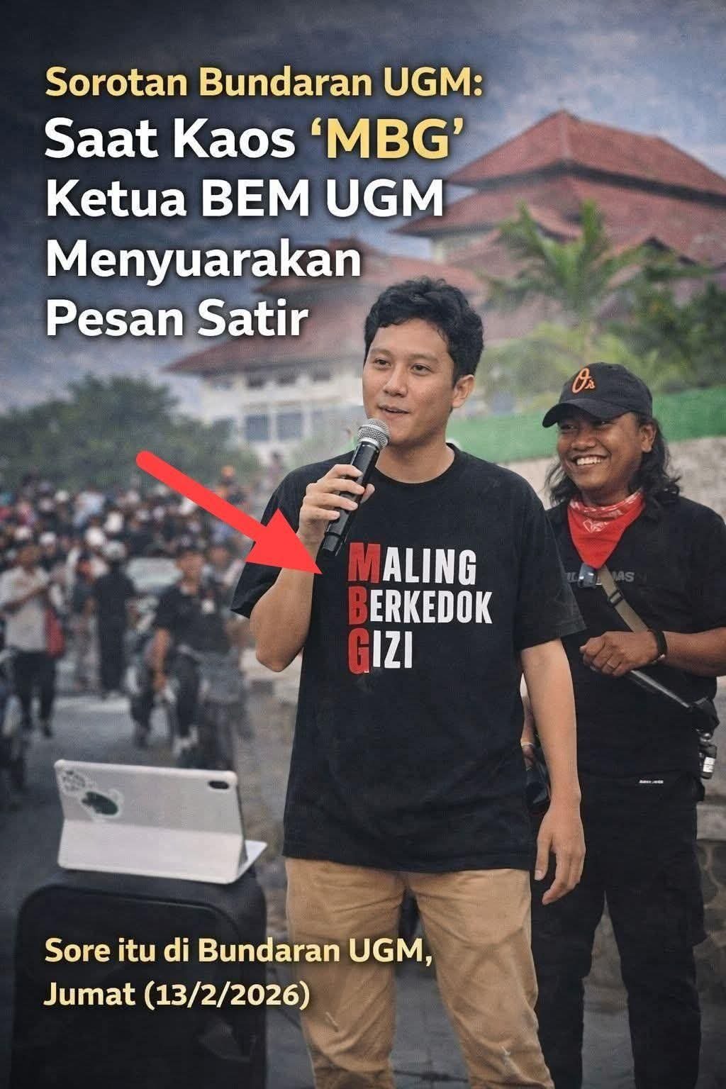 Ketua BEM Universitas Gadjah Mada, Tiyo Ardianto, dalam orasinya saat demo di Bundaran UGM, Jumat (13/2/2026), melontarkan kritik keras terhadap program Makan Bergizi Gratis (MBG). Videonya viral di media sosial.