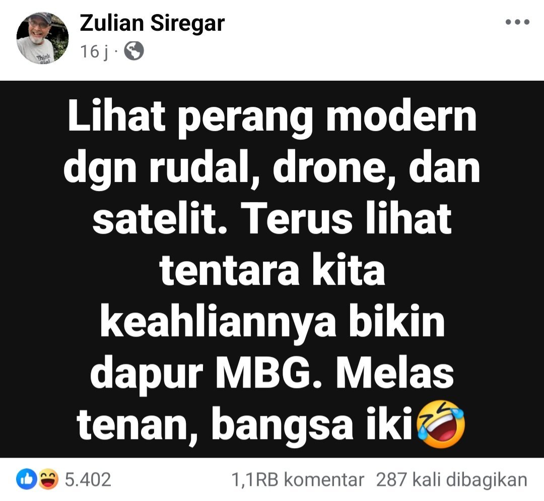 “Lihat perang modern dgn rudal, drone, dan satelit. Terus lihat tentara kita keahliannya bikin dapur MBG. Melas tenan, bangsa iki🤣,” sentil Zulian Siregar di akun facebooknya yang mendapat ribuan like.