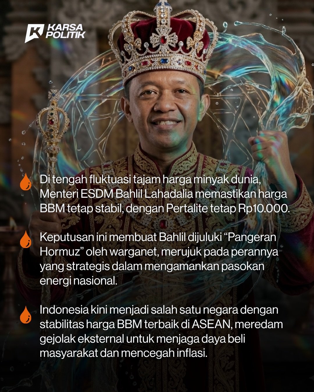Berhasil menjinakkan harga BBM di tengah badai global membuat Bahlil layak dijuluki “Pangeran Hormuz” sang penyelamat dompet rakyat. Ketika harga minyak dunia sedang ugal-ugalan, harga BBM subsidi tidak naik, apakah ini bukti ‘kesaktian’ Sang Menteri atau sekadar ‘jurus maut’ (nekat) demi menjaga ketenangan sebelum badai inflasi benar-benar datang?