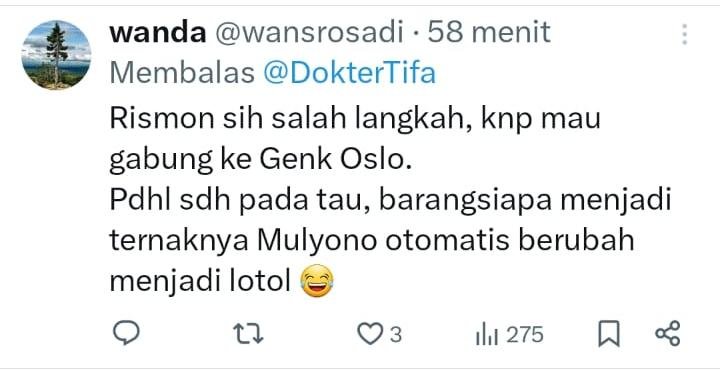 “Langkah melaporkan Rismon itu bagian dari untuk mempertanggungjawabkan pernyataan yang telah dia sampaikan, karena ini soal nama baik dan Pak JK tadi sudah sampaikan bahwa itu adalah fitnah, tuduhan fitnah sehingga ini harus disikapi secara serius,” ucapnya.