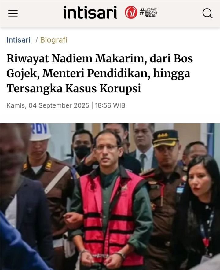 Mantan Menteri Pendidikan, Kebudayaan, Riset, dan Teknologi (Mendikbudristek) Nadiem Makarim kini berstatus tersangka kasus pengadaan laptop chromebook. Penetapan status tersangka oleh Kejaksaan Agung usai memeriksa Nadiem, Kamis (4/9/2025).