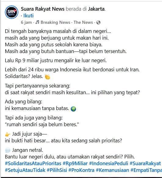 Argumen di atas menganggap donasi masyarakat Indonesia sebesar Rp 9 miliar ke iran (dalam hal ini konteks konflik Iran-Israel) sebagai bentuk “salah prioritas”. Narasi ini membenturkan empati publik dengan kondisi ekonomi domestik yang sulit, seolah-olah jika Rp 9 miliar itu tidak dikirim, masalah kemiskinan dan pendidikan di Indonesia otomatis tuntas.