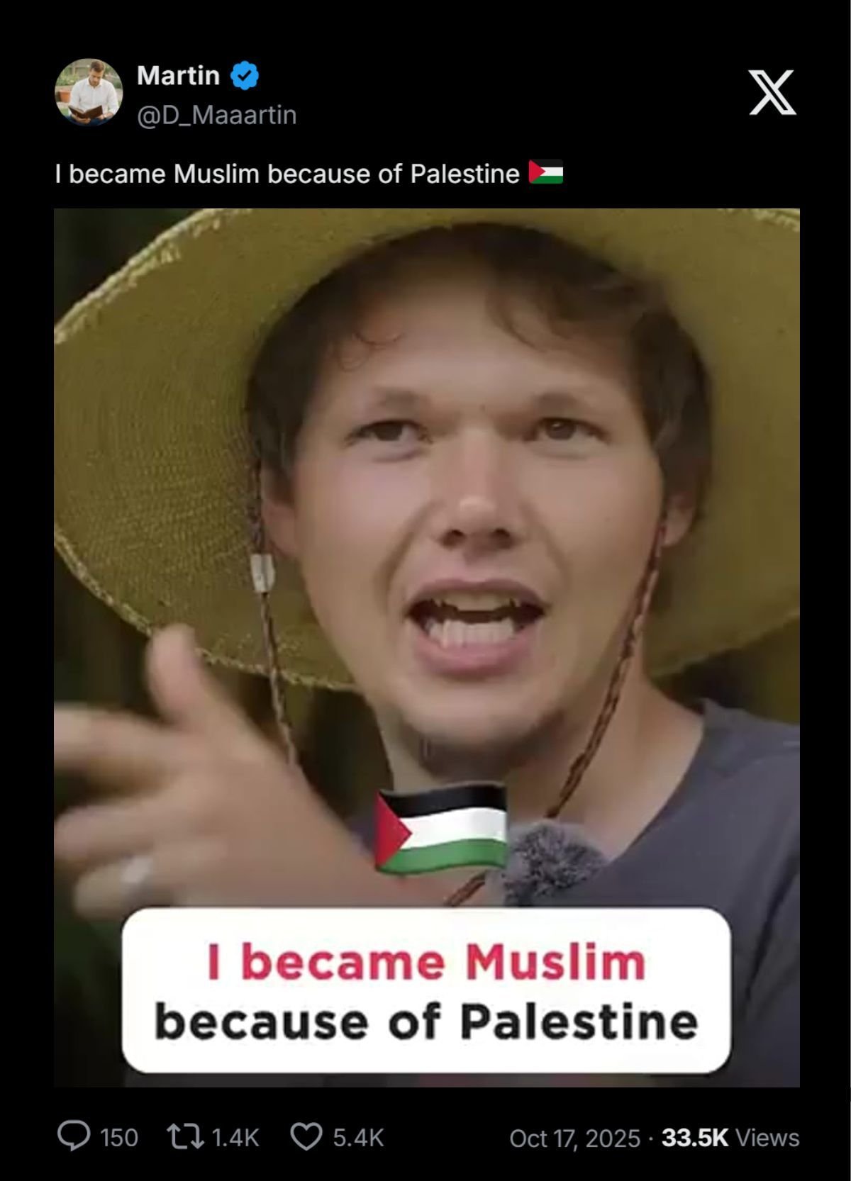 “Saya menjadi Muslim karena Palestina. Palestina mungkin adalah negara paling berpengaruh yang pernah saya kunjungi seumur hidup. Saya pergi ke Hebron, Tepi Barat, tempat itu benar-benar mengejutkan saya. Saya sampai di titik yang strategis, saya bisa melihat dari balik tembok, saya bisa melihat reruntuhan rumah-rumah Arab tua, blok-blok kota yang telah hancur, dan saya bisa melihat seperti sebuah kota, ya, 150.000 orang tepat di samping sekitar 500 pemukim yang dikepung oleh militer, dikepung oleh senapan mesin besar-besaran.