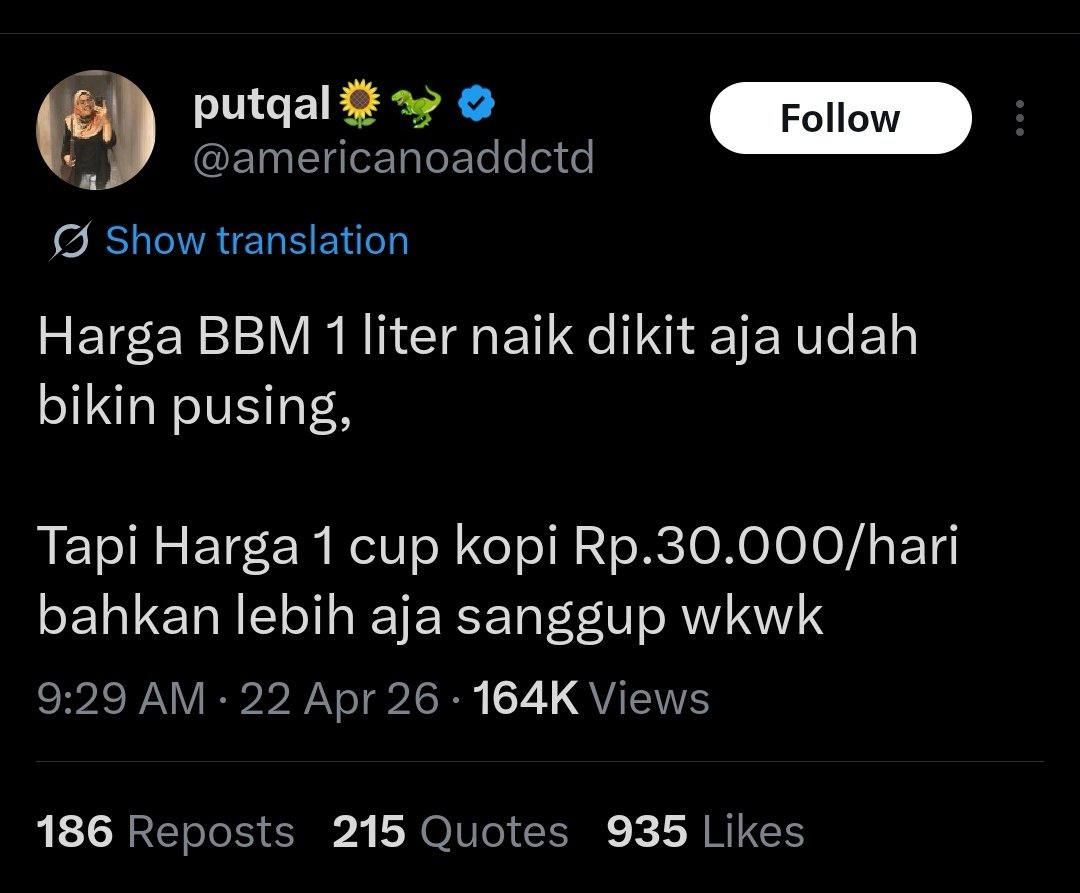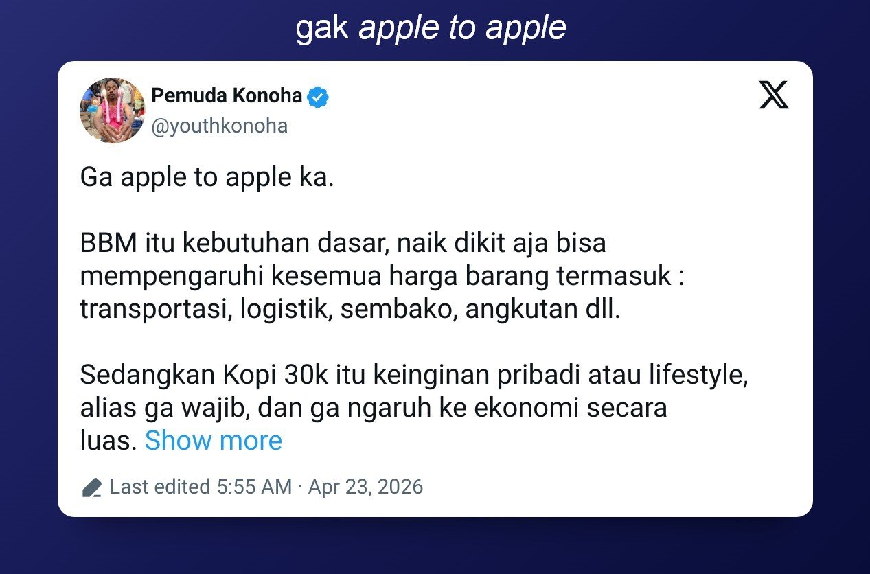 Sedangkan Kopi 30k itu keinginan pribadi atau lifestyle, alias ga wajib, dan ga ngaruh ke ekonomi secara luas. Masyarakat di desa jarang tuh beli yang harga segitu, mereka pake kopi sachet yg enak nan murah atau bahkan kopi dari hasil kebunnya sendiri yang gratis.