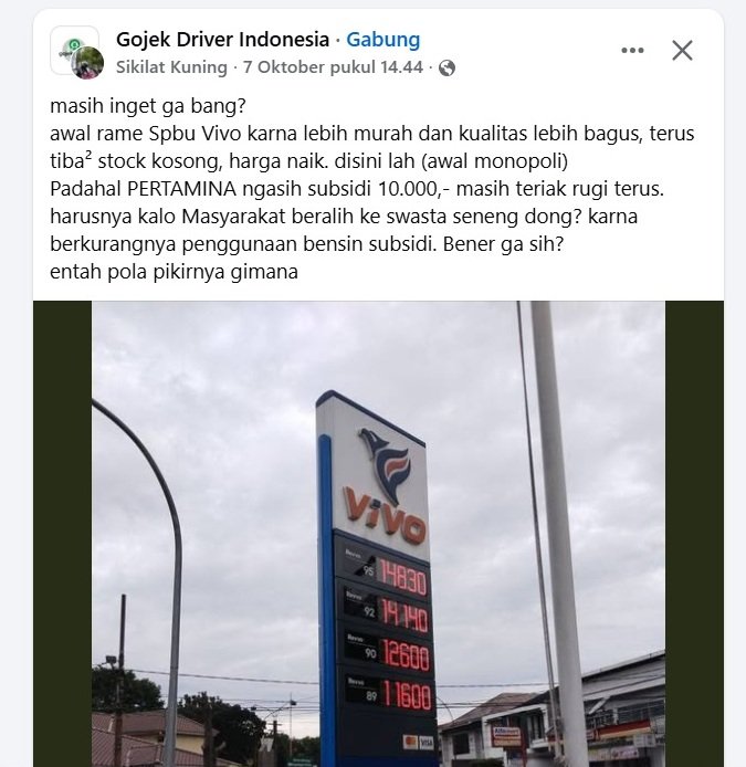 awal rame SPBU Vivo karna lebih murah dan kualitas lebih bagus, terus tiba² stock kosong, harga naik. disini lah (awal monopoli)