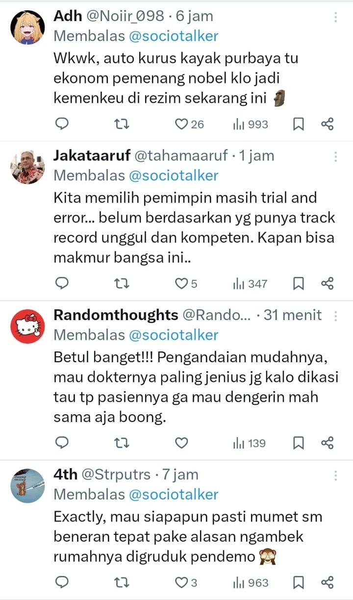 Hal ini menanggapi postingan netizen terkait Menkeu Purbaya dibandingkan dengan Menkeu-Menkeu sebelumnya, seperti Sri Mulyani Indrawati (SMI), Chatib Basri, Bambang Brodjonegoro.