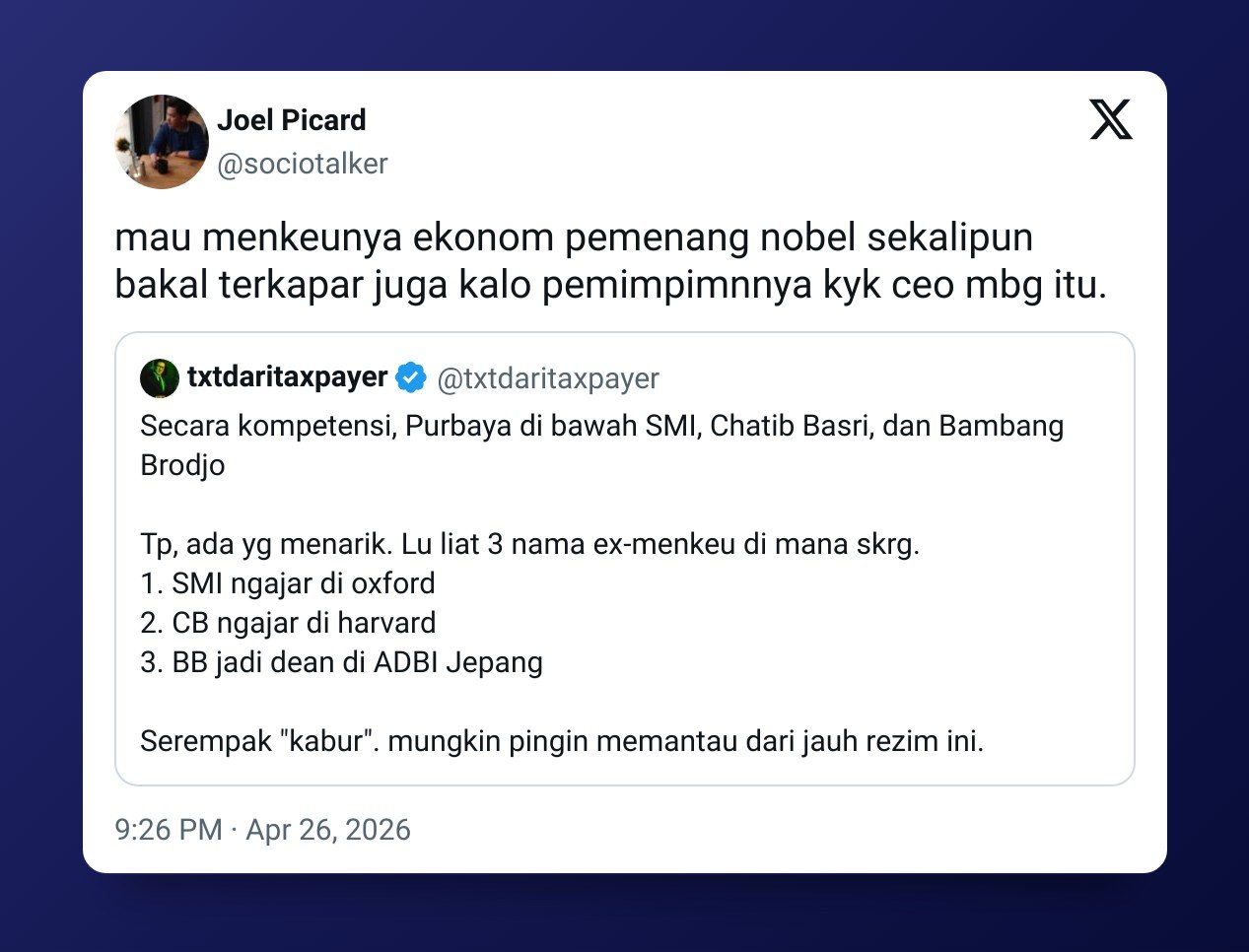 “mau menkeunya ekonom pemenang nobel sekalipun bakal terkapar juga kalo pemimpimnnya kyk ceo mbg itu,” sentil Prof. Sulfikar Amir di akun media sosialnya di X @sociotalker.