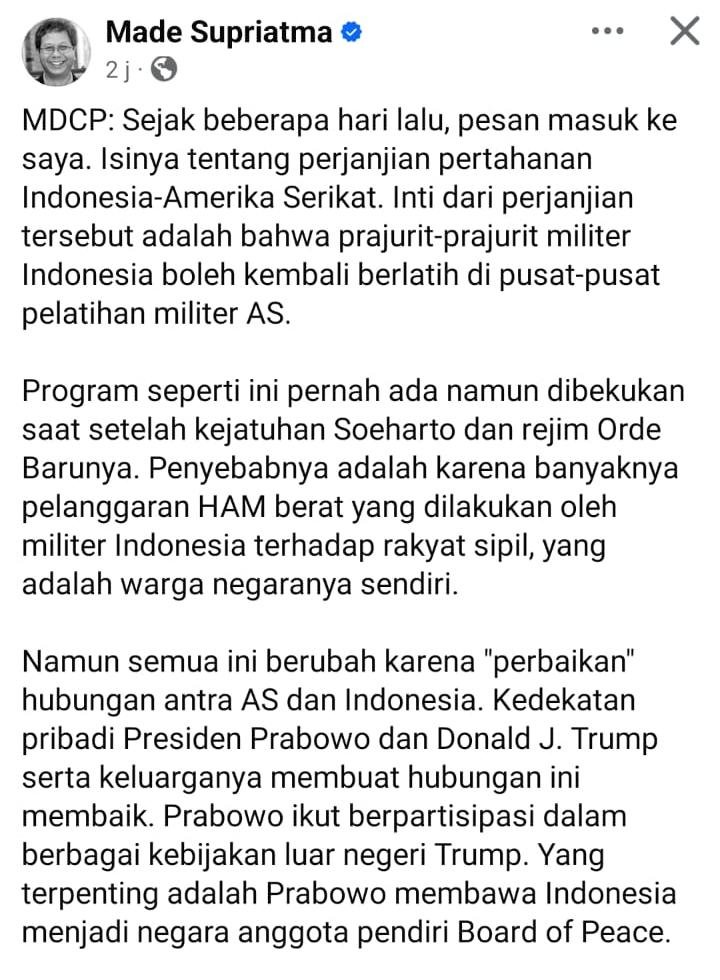 Sejak beberapa hari lalu, pesan masuk ke saya. Isinya tentang perjanjian pertahanan Indonesia-Amerika Serikat. Inti dari perjanjian tersebut adalah bahwa prajurit-prajurit militer Indonesia boleh kembali berlatih di pusat-pusat pelatihan militer AS.