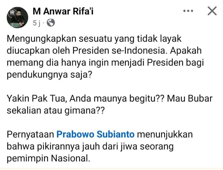 “Mengungkapkan sesuatu yang tidak layak diucapkan oleh Presiden se-Indonesia. Apakah memang dia hanya ingin menjadi Presiden bagi pendukungnya saja?