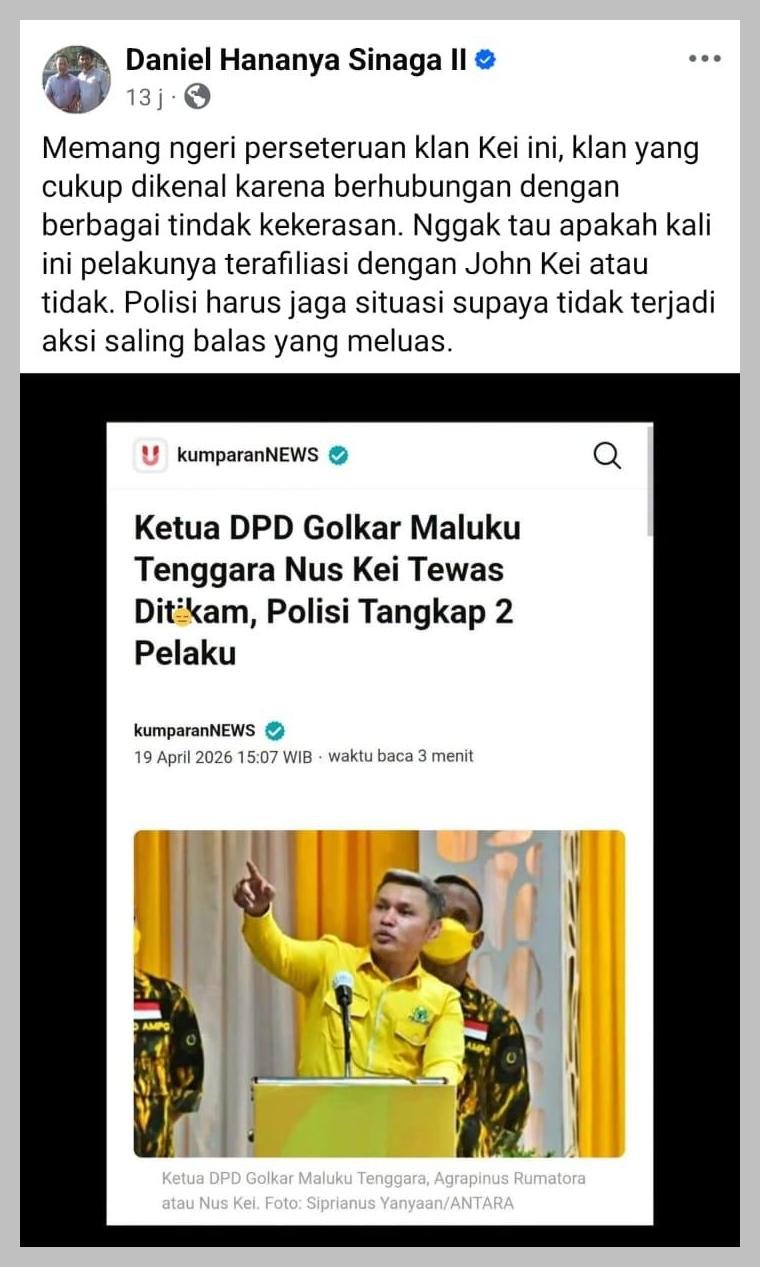 Ketua DPD Partai Golkar Maluku Tenggara, Agrapinus Rumatora alias Nus Kei, tewas usai ditikam orang tak dikenal pada Minggu (19/4/2026).
