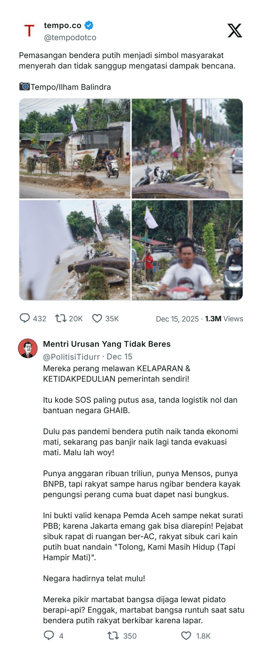 Sebelumnya, viral bendera putih dikibarkan di beberapa ruas jalan di Aceh dan diibaratkan sebagai tanda kondisi darurat.