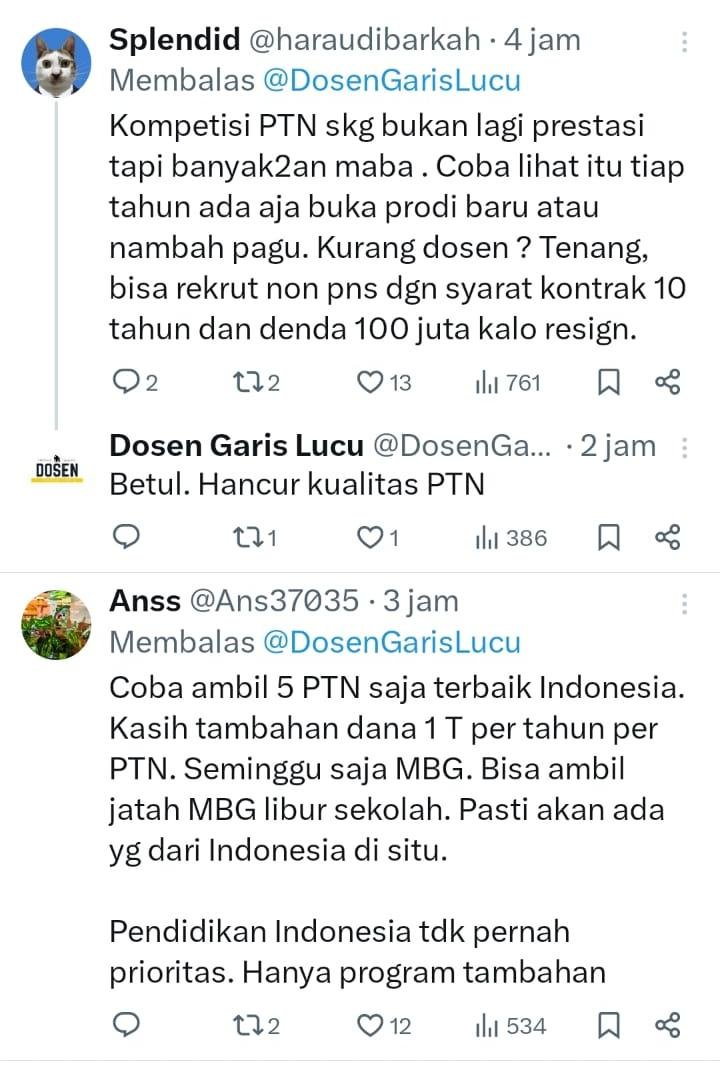 “Coba ambil 5 PTN saja terbaik Indonesia. Kasih tambahan dana 1 T per tahun per PTN. Seminggu saja MBG. Bisa ambil jatah MBG libur sekolah. Pasti akan ada yg dari Indonesia di situ. Pendidikan Indonesia tdk pernah prioritas. Hanya program tambahan,” timpal netizen.