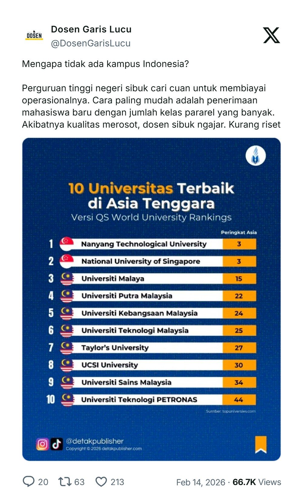 “Perguruan tinggi negeri sibuk cari cuan untuk membiayai operasionalnya. Cara paling mudah adalah penerimaan mahasiswa baru dengan jumlah kelas pararel yang banyak. Akibatnya kualitas merosot, dosen sibuk ngajar. Kurang riset,” cuit akun X @DosenGarisLucu.