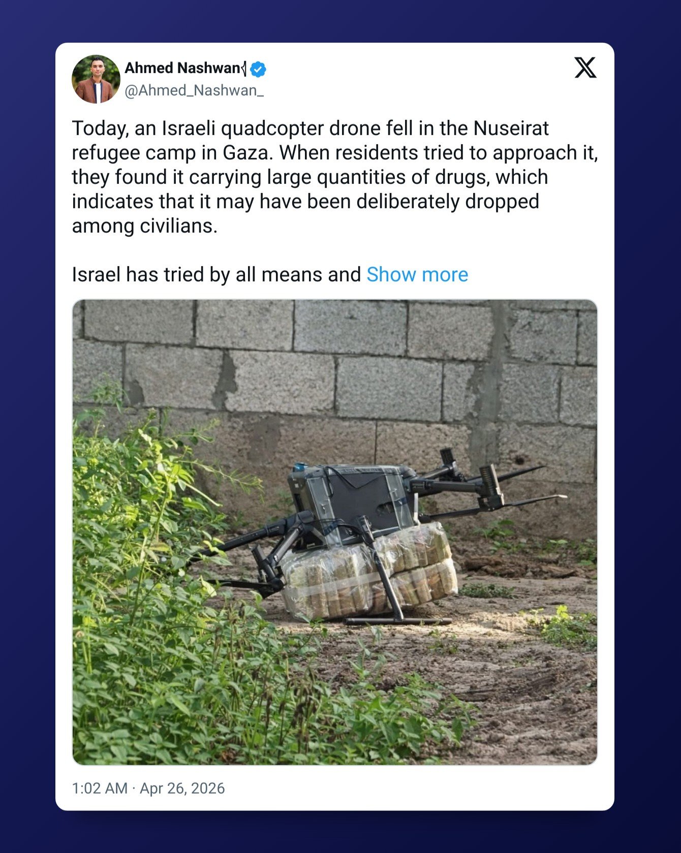 🔴Hari ini, sebuah drone quadcopter Israel jatuh di kamp pengungsi Nuseirat di Gaza. Ketika warga mencoba mendekatinya, mereka menemukan drone tersebut membawa sejumlah besar narkoba, yang menunjukkan bahwa drone itu mungkin sengaja dijatuhkan di antara warga sipil.