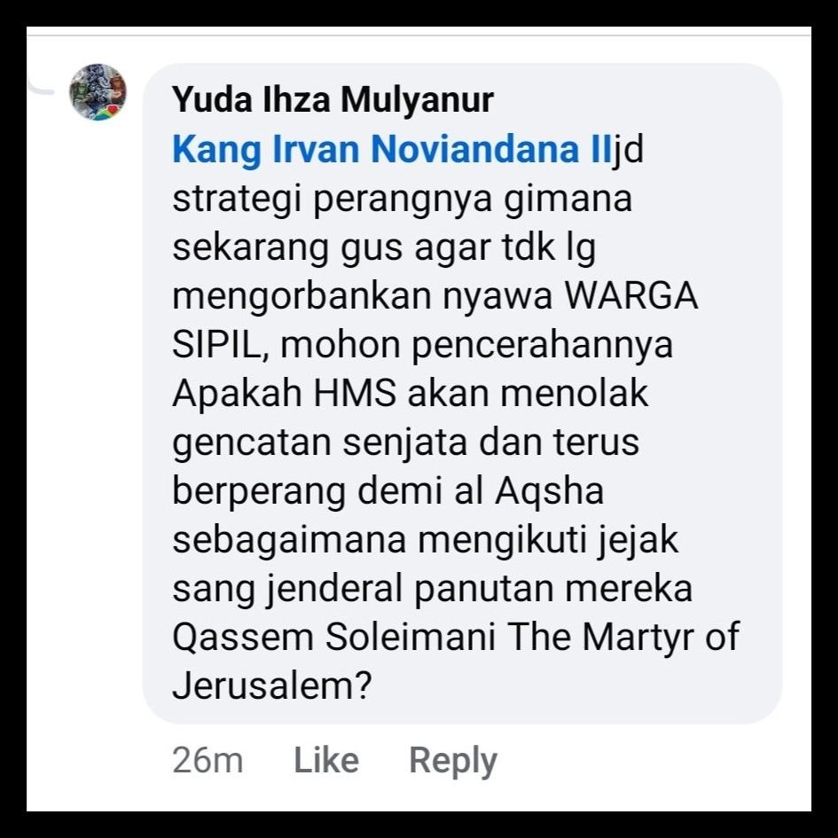 Saya menjawab pertanyaan Yuda Ihza Mulyanur (ss di atas) karena beberapa ybs menanyakan soal strategi HAMAS yang dianggap mengorbankan rakyat sipil.