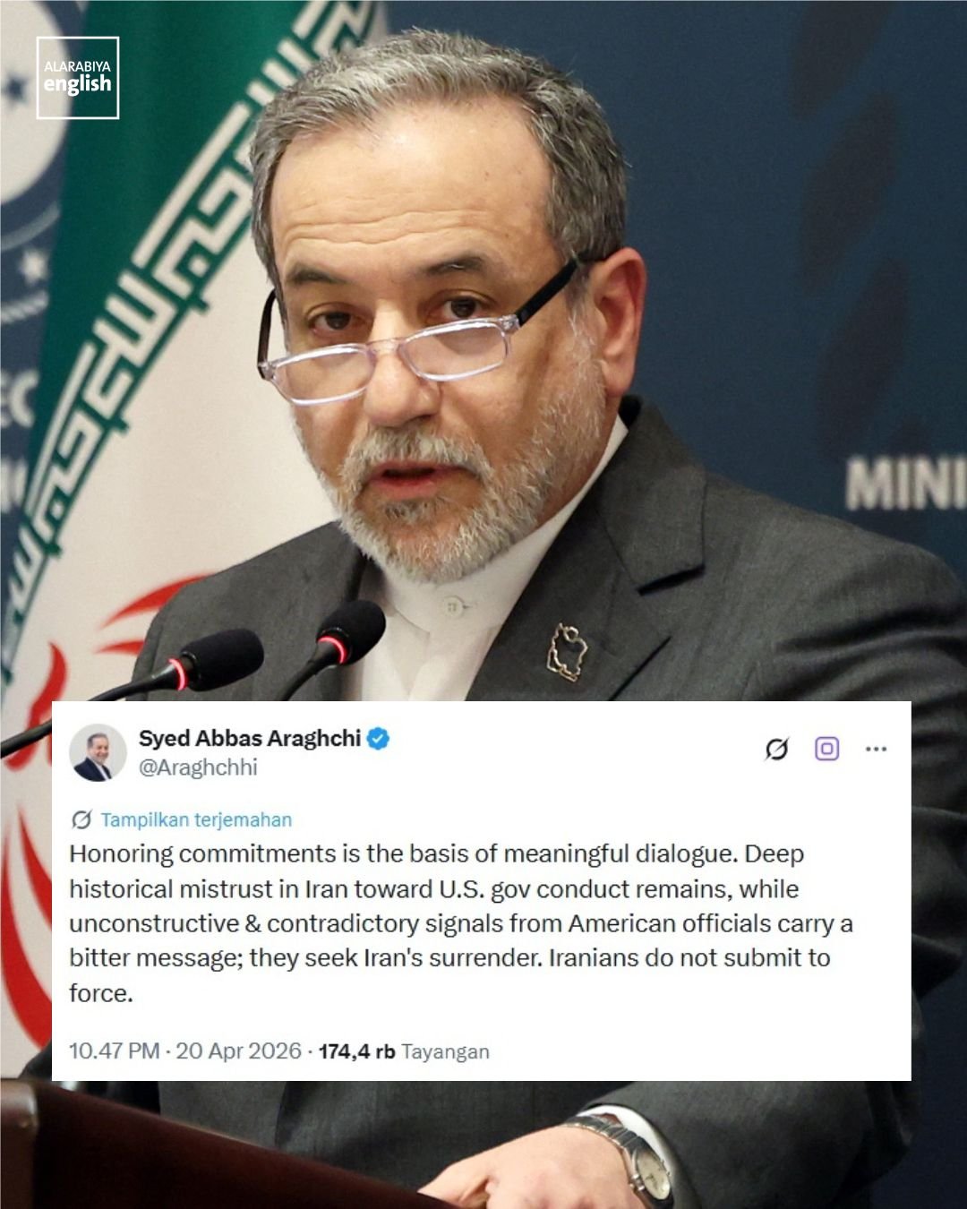 “Menghormati komitmen adalah dasar dari dialog yang bermakna. Ketidakpercayaan historis yang mendalam di Iran terhadap perilaku pemerintah AS tetap ada, sementara sinyal yang tidak konstruktif & kontradiktif dari pejabat Amerika membawa pesan yang pahit; mereka menginginkan penyerahan Iran. Orang Iran tidak menyerah pada kekuatan.”