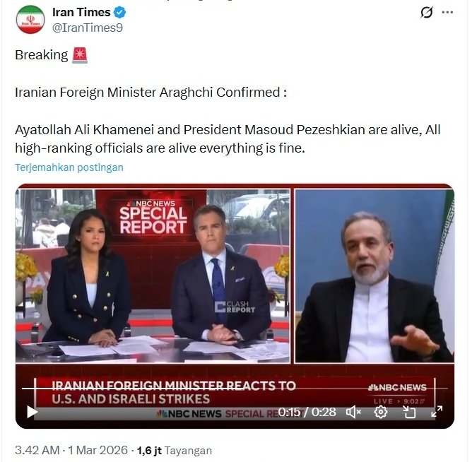 Menteri Luar Negeri Iran, Abbas Araghchi, telah memberikan pernyataan publik yang menegaskan bahwa Pemimpin Tertinggi Ayatollah Ali Khamenei dan Presiden Masoud Pezeshkian dalam kondisi selamat menyusul serangan militer besar-besaran dari Amerika Serikat dan Israel.